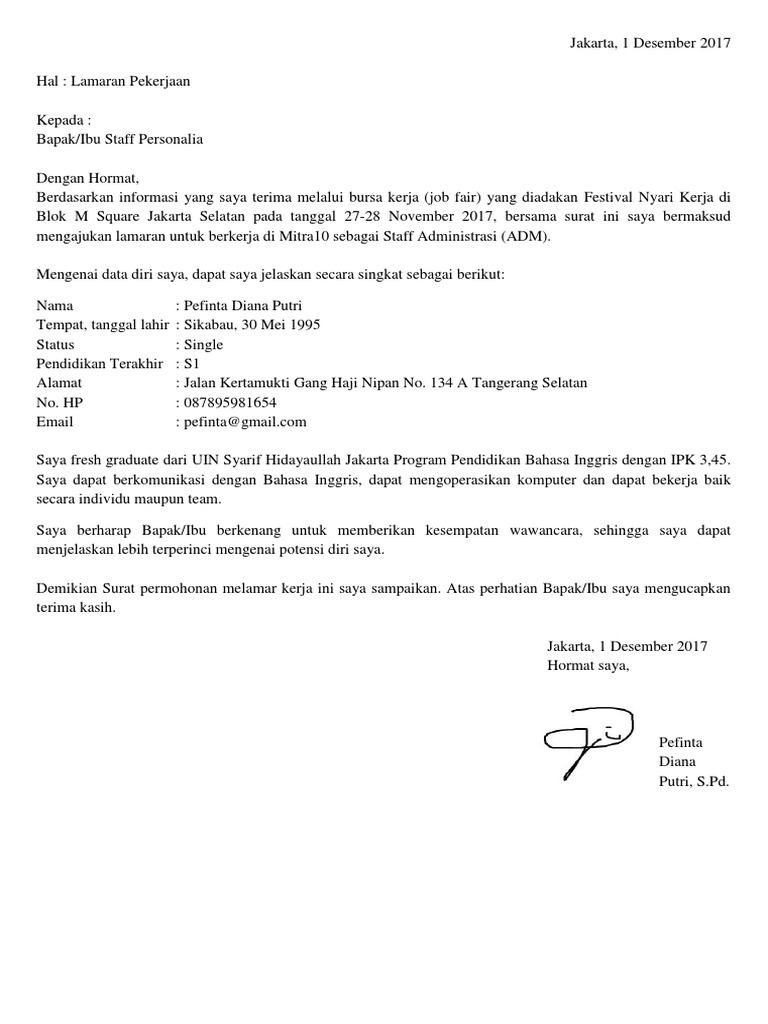 Sebagai bahan pertimbangan, saya lampirkan beberapa berkas administratif sebagai berikut Saya amanda maftuha mila, lulusan baru dari universitas mangkubuana, fakultas ekonomi dan bisnis, jurusan administrasi bisnis. Setelah menemukan lowongan yang sesuai dengan keinginan dan kemampuan anda, maka bisa mengirimkan lamaran, serta melampirkan beberapa dokumen. Perhatikan kebersihan surat lamaran kerja. Writing this letter, i wish to apply for the position of accounting staff which was advertised on koran pagi, june 18, 2004. Enggak usah khawatir, contoh surat lamaran kerja bahasa inggris di bawah ini bisa membantumu mendapatkan profesi yang sudah kamu impikan sejak lama! Jika sebelumnya admin membagikn contoh referensi kepada kalian surat lamaran pekerjaan bidang staff akunting, kali ini admin akan membagikan kepada kalian contoh surat lamaran kerja dalam bahasa inggris di bidang staff administrasi. Contoh surat lamaran pekerjaan sebagai guru dalam bahasa inggris. Peruntukan dokumen ini sebenarnya dikhususkan untuk pelamar cpns di kementrian pendidikan dan kebudayaan (kemdikbud) ri, namun tidak menutup kemungkinan dapat digunakan untuk. Saya menulis surat ini sebagai respon terhadap lowongan kerja posisi administrator yang diiklankan di laman web persahaan anda. Sebagai bahan pertimbangan, berikut saya lampirkan: Contoh surat lamaran kerja di pt sebagai karyawan. Tidak heran kalau banyak orang beranggapan bahwa surat lamaran adalah kunci pertama dalam.