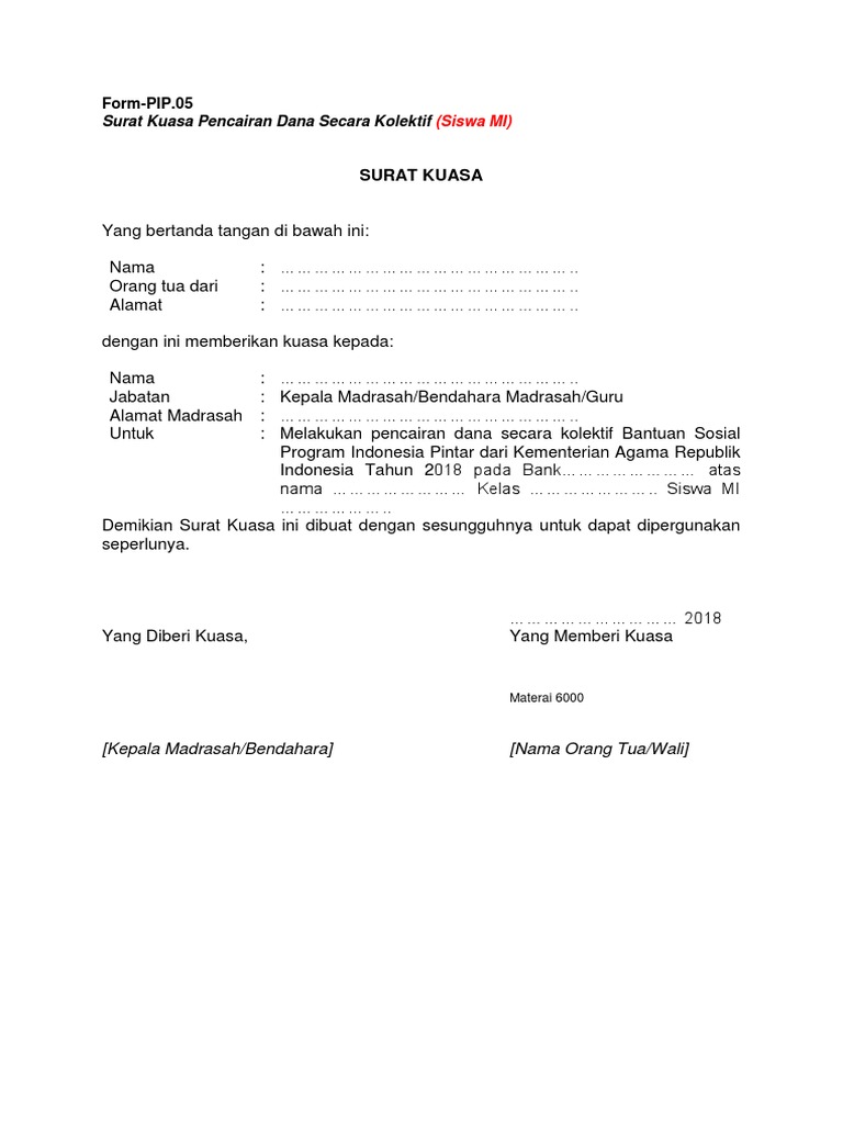 Contoh Surat Kuasa Pengambilan Pip Ke Bri Contoh Seputar Surat from 0.academia-photos.com Dengan surat ini, saya selaku pemberi kuasa, memberikan kuasa kepada karyawan saya yang bernama ayu lestari ningsih (penerima kuasa) untuk melakukan pengambilan uang secara tunai dengan jumlah rp. Bagi siswa atau wali siswa yang akan melakukan pengambilan/pencairan bantuan pip secara langsung atau mandiri maka harus menyiapkan beberapa dokumen yang diantaranya adalah sebagai berikut : Das komplette pip studio sortiment. Dengan beberapa persyaratan, dana polis asuransi memang bisa diambil kembali.semua syarat dan peraturan yang harus dipenuhi tentunya akan tergantung dari kebijakan asuransi yang digunakan. Contoh surat kuasa pengambilan pip kolektif | terkadang ada beberapa siswa penerima bantuan program indonesia pintar (pip) yang tidak sempat untuk mengambil bantuan pip. Segala resiko yang terjadi menjadi tanggun jawab saya selaku pemberi kuasa. Dalam pengambilan tentunya disertai dengan surat kuasa mengambil uang pip ke bank dan ada lampiran tanda tangan yang memberi kuasa yaitu para santri penerima dana program pip. Maka solusinya bisa dengan surat kuasa pengambilan pip kolektif.