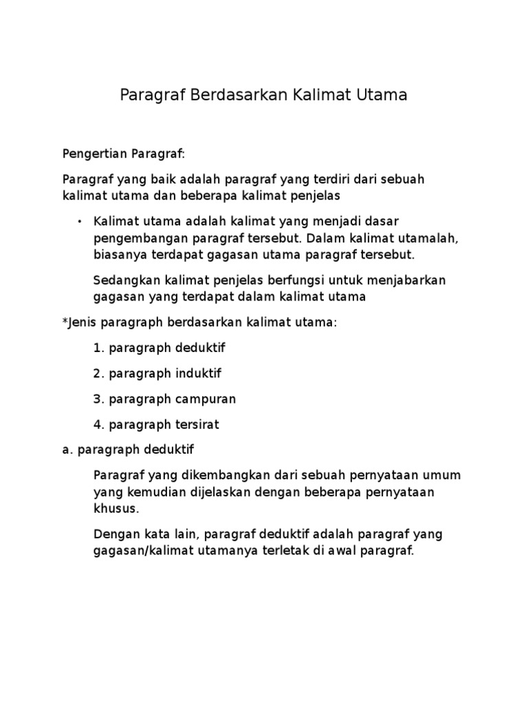 Jenis Jenis Paragraf Berdasarkan Letak Kalimat Utama from imgv2-1-f.scribdassets.com Kalimat utama biasanya bersifat umum dan memuat keseluruhan isi dalam suatu paragraf. Budaya laut harus diajarkan sejak dini. Salah satunya adalah kalimat utama suatu paragraf. Contoh paragraf deduktif dan paragraf induktif populer. Kesatuan.barulah dapat dikatakan baik pada sebuah paragraf yang apabila mempunyai satu kesatuan antara gagasan utama dan kalimat penjelas dan saling terhubung satu sama lain secara utuh. Satu lagi pesawat luar angkasa milik nasa yang nyaris mencelakai para awaknya. Paragraf yang efektif selalu mampu mengarahkan pembaca ke mana arah pembicaraan topik utama. Kalimat utama sendiri merupakan kalimat yang berisi pokok utama sebuah paragraf.